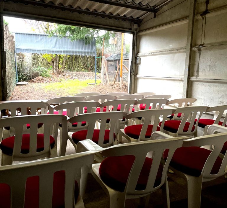 En cas de très mauvaise météo. Possibilité de mettre un écran à l'intérieur. Dans la salle du siège sociale.